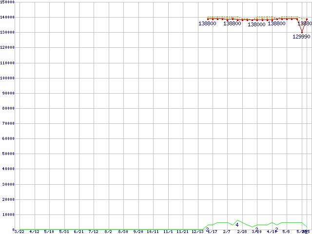 ※このグラフは過去のデータも税率5%相当に調整した税込み相当額のグラフです。 税率変更や、総額表示方式導入(2004年4月)の影響は除いています。 | | | ●凡例 | 最安値 (点線部は販売店未確認 または未調査) | 平均値 | 最高値 | ショップ数 |