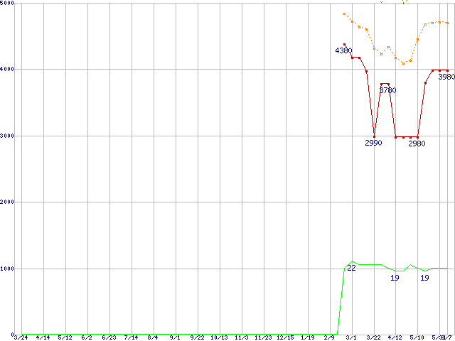※このグラフは過去のデータも税率5%相当に調整した税込み相当額のグラフです。 税率変更や、総額表示方式導入(2004年4月)の影響は除いています。 | | | ●凡例 | 最安値 (点線部は販売店未確認 または未調査) | 平均値 | 最高値 | ショップ数 |