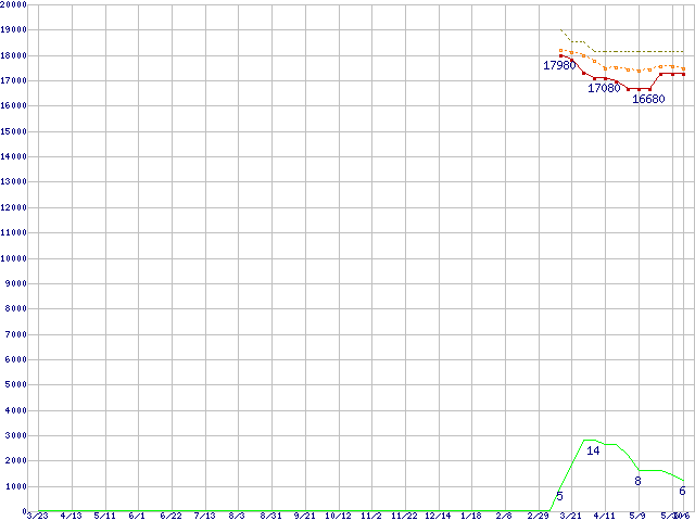 ※このグラフは過去のデータも税率5%相当に調整した税込み相当額のグラフです。 税率変更や、総額表示方式導入(2004年4月)の影響は除いています。 | | | ●凡例 | 最安値 (点線部は販売店未確認 または未調査) | 平均値 | 最高値 | ショップ数 |