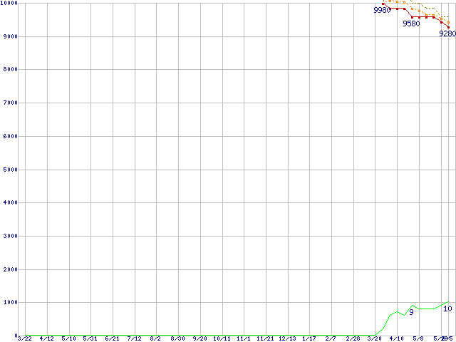 ※このグラフは過去のデータも税率5%相当に調整した税込み相当額のグラフです。 税率変更や、総額表示方式導入(2004年4月)の影響は除いています。 | | | ●凡例 | 最安値 (点線部は販売店未確認 または未調査) | 平均値 | 最高値 | ショップ数 |