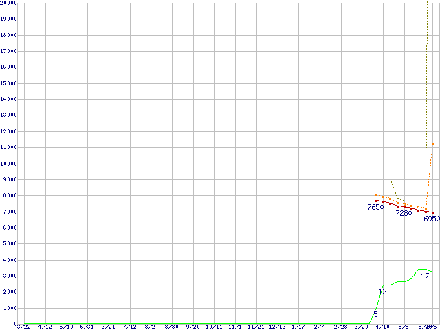 ※このグラフは過去のデータも税率5%相当に調整した税込み相当額のグラフです。 税率変更や、総額表示方式導入(2004年4月)の影響は除いています。 | | | ●凡例 | 最安値 (点線部は販売店未確認 または未調査) | 平均値 | 最高値 | ショップ数 |