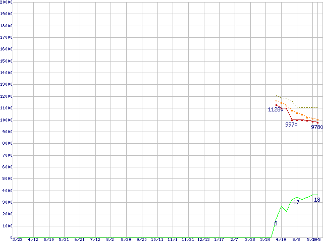 ※このグラフは過去のデータも税率5%相当に調整した税込み相当額のグラフです。 税率変更や、総額表示方式導入(2004年4月)の影響は除いています。 | | | ●凡例 | 最安値 (点線部は販売店未確認 または未調査) | 平均値 | 最高値 | ショップ数 |