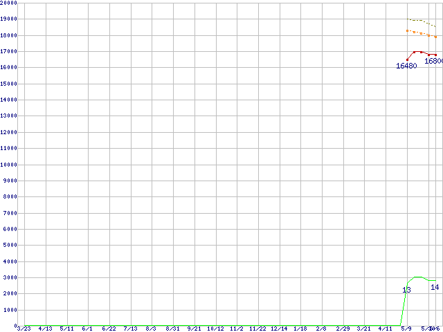 ※このグラフは過去のデータも税率5%相当に調整した税込み相当額のグラフです。 税率変更や、総額表示方式導入(2004年4月)の影響は除いています。 | | | ●凡例 | 最安値 (点線部は販売店未確認 または未調査) | 平均値 | 最高値 | ショップ数 |