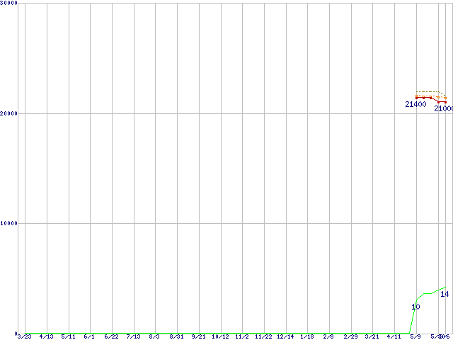 ※このグラフは過去のデータも税率5%相当に調整した税込み相当額のグラフです。 税率変更や、総額表示方式導入(2004年4月)の影響は除いています。 | | | ●凡例 | 最安値 (点線部は販売店未確認 または未調査) | 平均値 | 最高値 | ショップ数 |