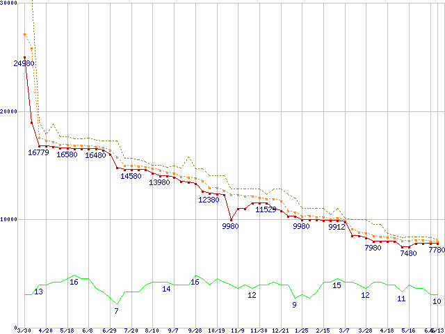| Athlon X2 4800 (2.5GHz,L2 512KB×2)の価格推移 | | | (2007年3月30日~2008年6月13日) |