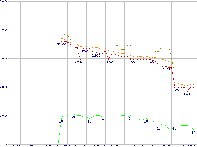 | Core 2 Duo E6850 (3GHz,L2 4MB)の価格推移 | | | (2007年3月30日~2008年6月13日) |