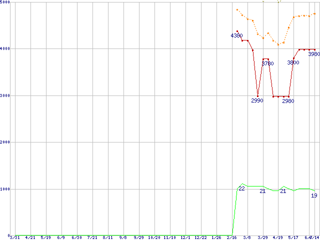 ※このグラフは過去のデータも税率5%相当に調整した税込み相当額のグラフです。 税率変更や、総額表示方式導入(2004年4月)の影響は除いています。 | | | ●凡例 | 最安値 (点線部は販売店未確認 または未調査) | 平均値 | 最高値 | ショップ数 |