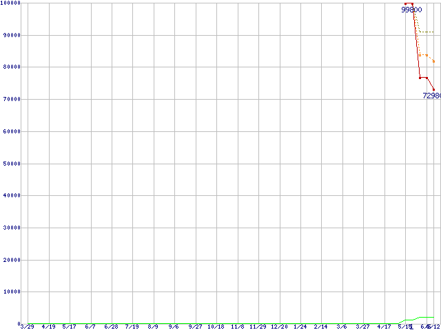 ※このグラフは過去のデータも税率5%相当に調整した税込み相当額のグラフです。 税率変更や、総額表示方式導入(2004年4月)の影響は除いています。 | | | ●凡例 | 最安値 (点線部は販売店未確認 または未調査) | 平均値 | 最高値 | ショップ数 |