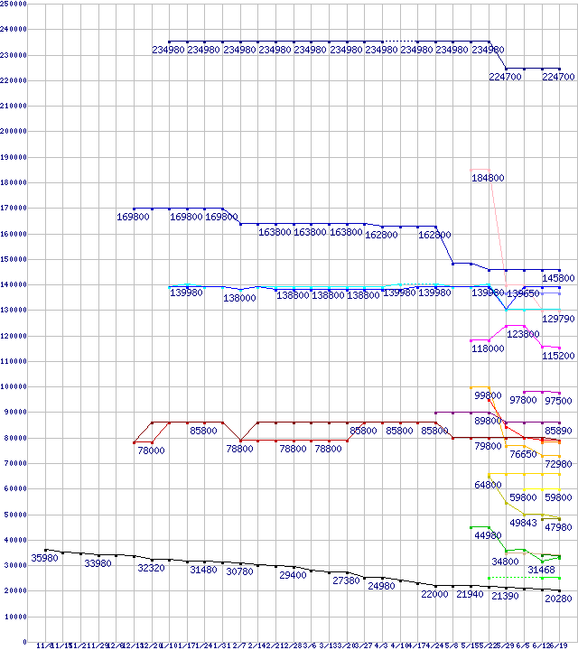 | HDD/SSD主要製品(最安値2万円以上)の最安値推移 | | | (2007年11月8日~2008年6月19日) |