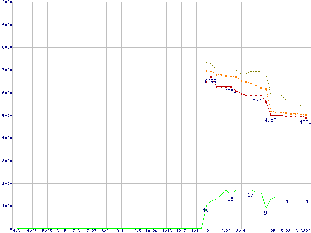 ※このグラフは過去のデータも税率5%相当に調整した税込み相当額のグラフです。 税率変更や、総額表示方式導入(2004年4月)の影響は除いています。 | | | ●凡例 | 最安値 (点線部は販売店未確認 または未調査) | 平均値 | 最高値 | ショップ数 |