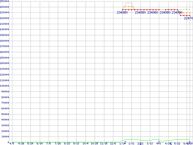 ※このグラフは過去のデータも税率5%相当に調整した税込み相当額のグラフです。 税率変更や、総額表示方式導入(2004年4月)の影響は除いています。 | | | ●凡例 | 最安値 (点線部は販売店未確認 または未調査) | 平均値 | 最高値 | ショップ数 |