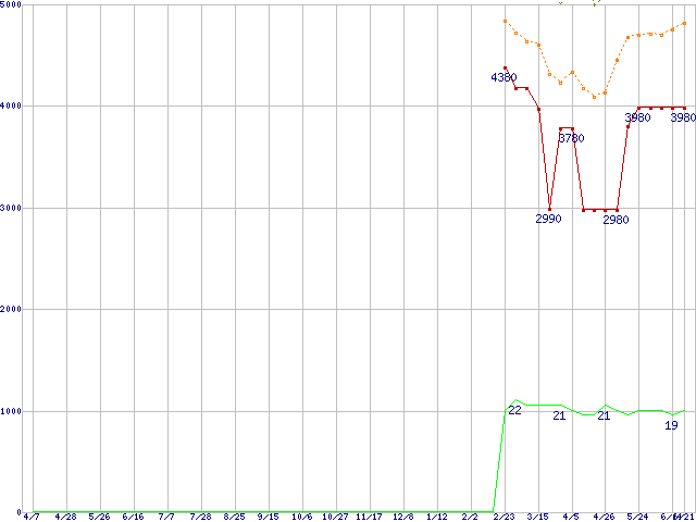 ※このグラフは過去のデータも税率5%相当に調整した税込み相当額のグラフです。 税率変更や、総額表示方式導入(2004年4月)の影響は除いています。 | | | ●凡例 | 最安値 (点線部は販売店未確認 または未調査) | 平均値 | 最高値 | ショップ数 |