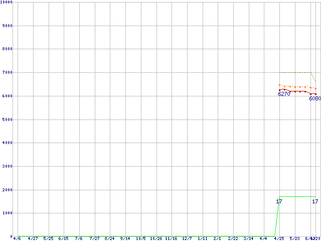 ※このグラフは過去のデータも税率5%相当に調整した税込み相当額のグラフです。 税率変更や、総額表示方式導入(2004年4月)の影響は除いています。 | | | ●凡例 | 最安値 (点線部は販売店未確認 または未調査) | 平均値 | 最高値 | ショップ数 |