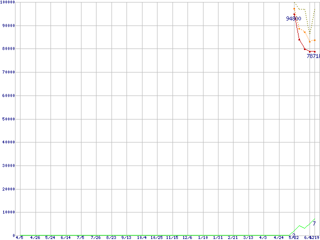※このグラフは過去のデータも税率5%相当に調整した税込み相当額のグラフです。 税率変更や、総額表示方式導入(2004年4月)の影響は除いています。 | | | ●凡例 | 最安値 (点線部は販売店未確認 または未調査) | 平均値 | 最高値 | ショップ数 |