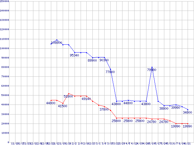 PC2-6400(DDR2-800) DDR2 SDRAM DIMMの最安値推移