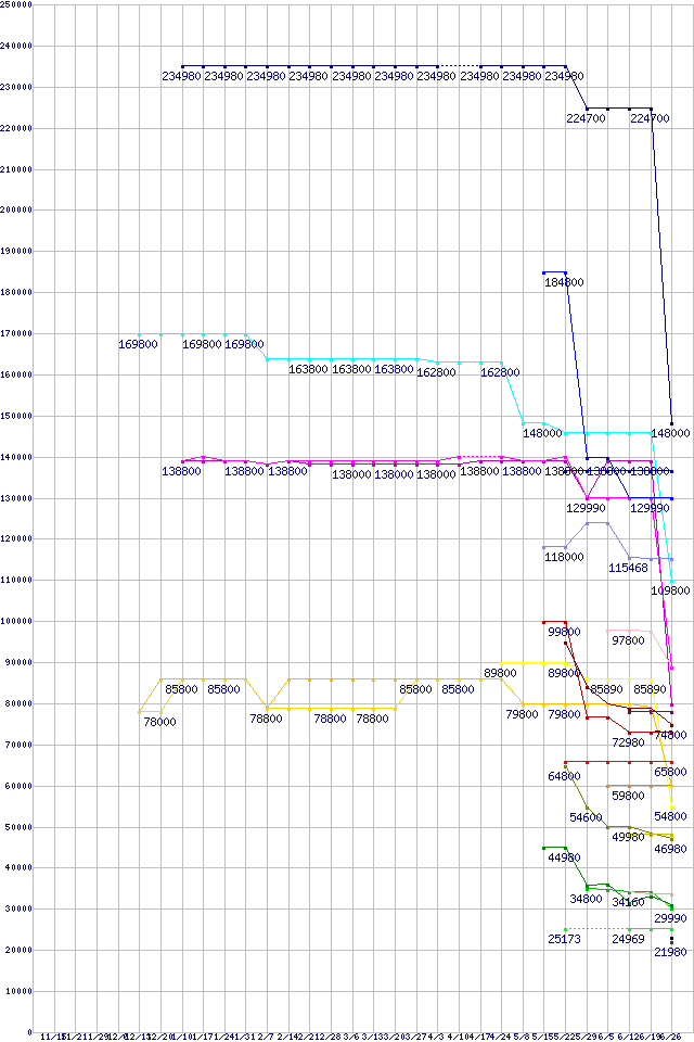 | HDD/SSD主要製品(最安値2万円以上)の最安値推移 | | | (2007年11月15日~2008年6月26日) |
