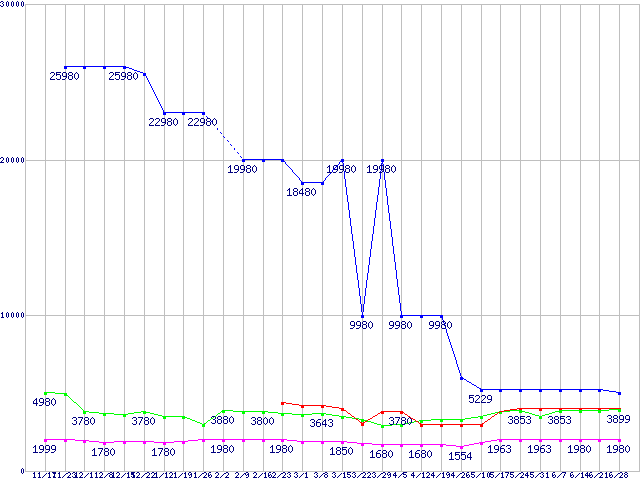 メモリ主要製品(最安値5千円未満)の最安値推移