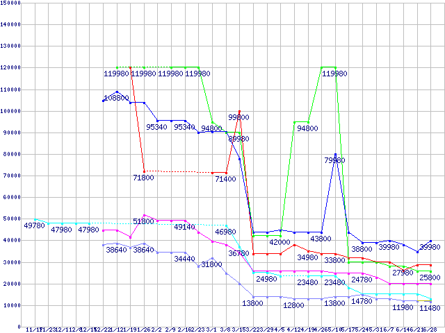 メモリ主要製品(最安値1万円以上)の最安値推移