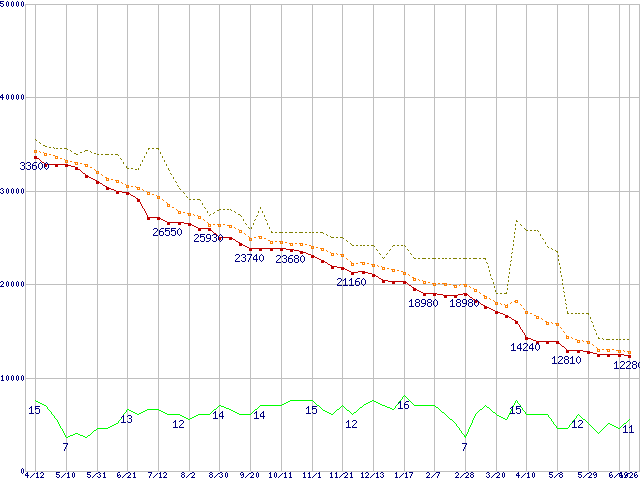 ※このグラフは過去のデータも税率5%相当に調整した税込み相当額のグラフです。 税率変更や、総額表示方式導入(2004年4月)の影響は除いています。 | | | ●凡例 | 最安値 (点線部は販売店未確認 または未調査) | 平均値 | 最高値 | ショップ数 |