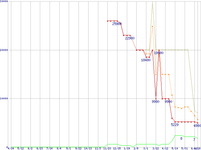 ※このグラフは過去のデータも税率5%相当に調整した税込み相当額のグラフです。 税率変更や、総額表示方式導入(2004年4月)の影響は除いています。 | | | ●凡例 | 最安値 (点線部は販売店未確認 または未調査) | 平均値 | 最高値 | ショップ数 |