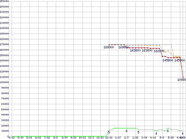 ※このグラフは過去のデータも税率5%相当に調整した税込み相当額のグラフです。 税率変更や、総額表示方式導入(2004年4月)の影響は除いています。 | | | ●凡例 | 最安値 (点線部は販売店未確認 または未調査) | 平均値 | 最高値 | ショップ数 |