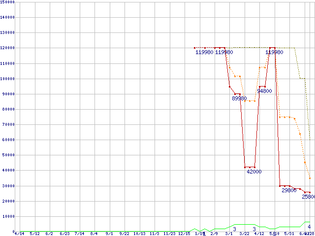 ※このグラフは過去のデータも税率5%相当に調整した税込み相当額のグラフです。 税率変更や、総額表示方式導入(2004年4月)の影響は除いています。 | | | ●凡例 | 最安値 (点線部は販売店未確認 または未調査) | 平均値 | 最高値 | ショップ数 |