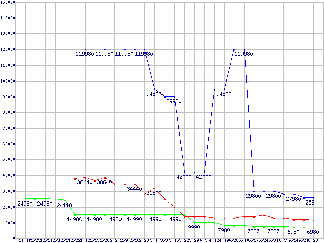 PC3-12800(DDR3-1600) DDR3 SDRAM DIMMの最安値推移