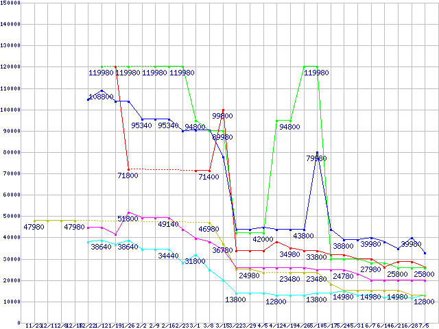 メモリ主要製品(最安値5千円~1万円未満)の最安値推移