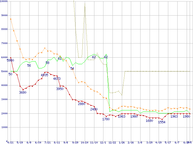 ※このグラフは過去のデータも税率5%相当に調整した税込み相当額のグラフです。 税率変更や、総額表示方式導入(2004年4月)の影響は除いています。 | | | ●凡例 | 最安値 (点線部は販売店未確認 または未調査) | 平均値 | 最高値 | ショップ数 |