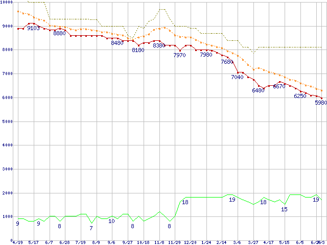 ※このグラフは過去のデータも税率5%相当に調整した税込み相当額のグラフです。 税率変更や、総額表示方式導入(2004年4月)の影響は除いています。 | | | ●凡例 | 最安値 (点線部は販売店未確認 または未調査) | 平均値 | 最高値 | ショップ数 |