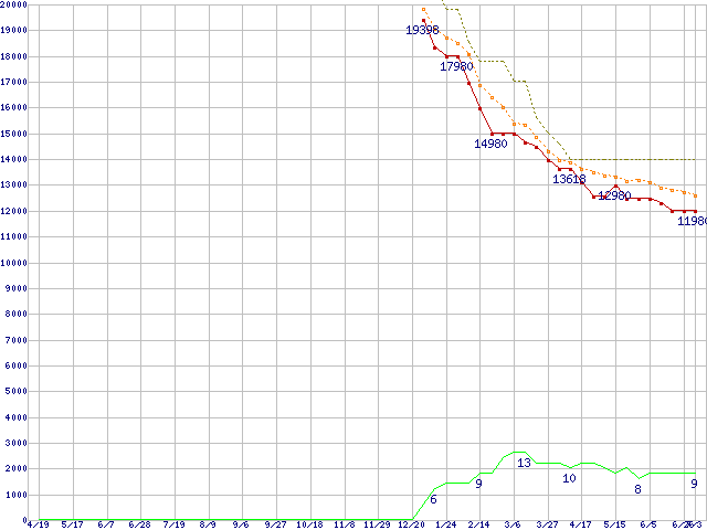 ※このグラフは過去のデータも税率5%相当に調整した税込み相当額のグラフです。 税率変更や、総額表示方式導入(2004年4月)の影響は除いています。 | | | ●凡例 | 最安値 (点線部は販売店未確認 または未調査) | 平均値 | 最高値 | ショップ数 |