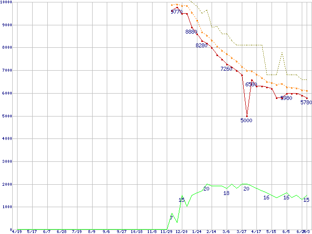 ※このグラフは過去のデータも税率5%相当に調整した税込み相当額のグラフです。 税率変更や、総額表示方式導入(2004年4月)の影響は除いています。 | | | ●凡例 | 最安値 (点線部は販売店未確認 または未調査) | 平均値 | 最高値 | ショップ数 |