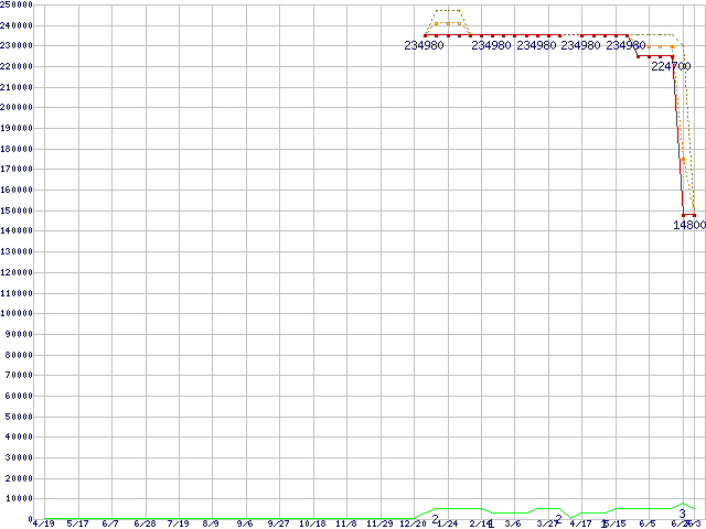 ※このグラフは過去のデータも税率5%相当に調整した税込み相当額のグラフです。 税率変更や、総額表示方式導入(2004年4月)の影響は除いています。 | | | ●凡例 | 最安値 (点線部は販売店未確認 または未調査) | 平均値 | 最高値 | ショップ数 |