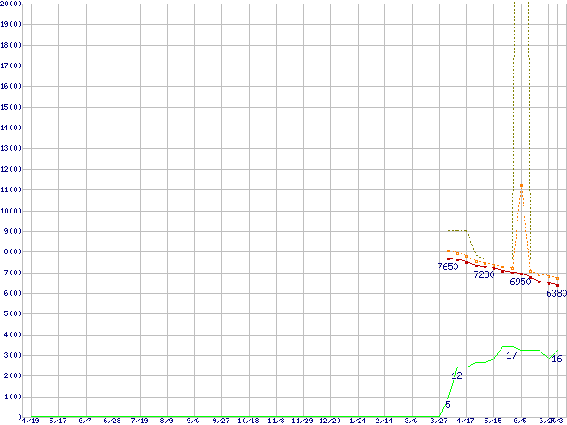 ※このグラフは過去のデータも税率5%相当に調整した税込み相当額のグラフです。 税率変更や、総額表示方式導入(2004年4月)の影響は除いています。 | | | ●凡例 | 最安値 (点線部は販売店未確認 または未調査) | 平均値 | 最高値 | ショップ数 |