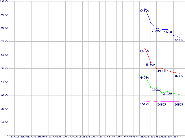 | MasterDrive MX SATA-II 25 (SSD,1.5Gb/s,2.5インチ)の最安値推移 | | | (2007年11月21日~2008年7月3日) |