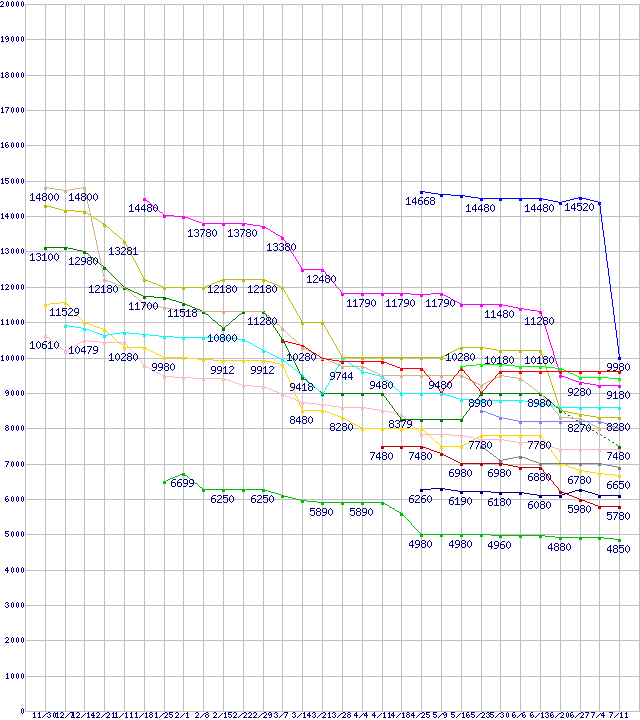 | CPU主要製品(最安値1万円未満)の最安値推移 | | | (2007年11月30日~2008年7月11日) |