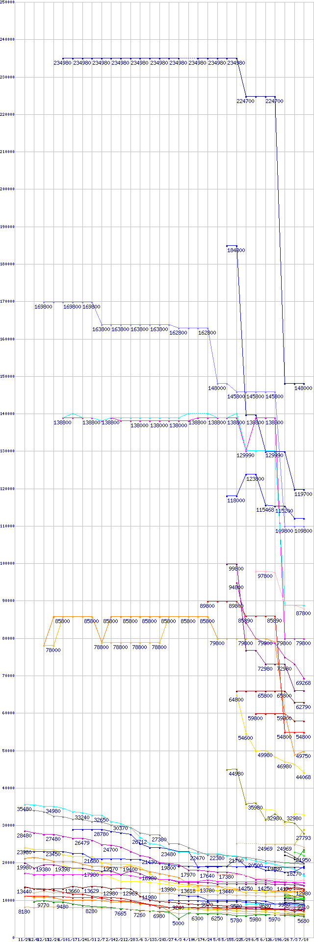 | HDD/SSD主要製品の最安値推移 | | | (2007年11月29日~2008年7月10日) |