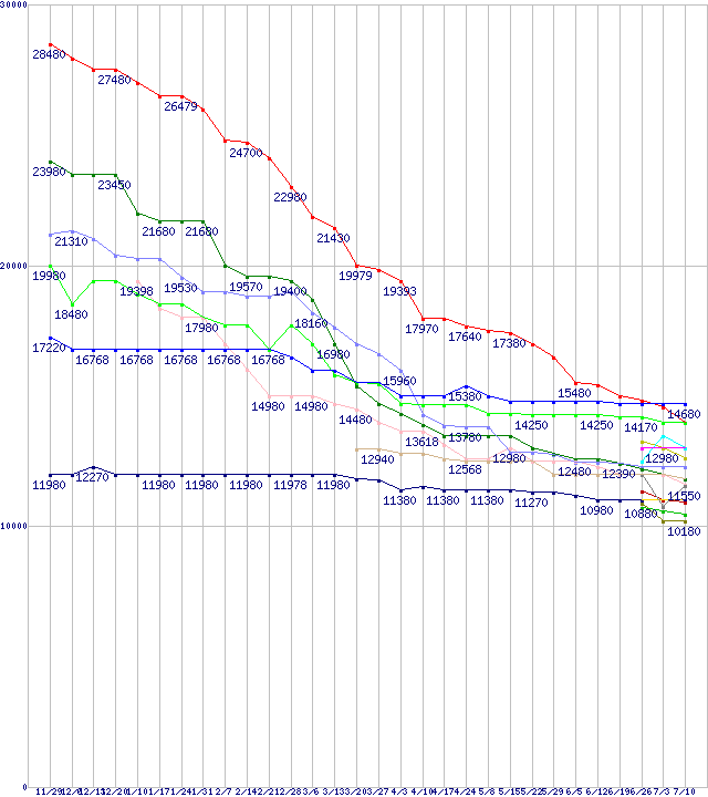 | HDD/SSD主要製品(最安値1万円~1万5千円未満)の最安値推移 | | | (2007年11月29日~2008年7月10日) |