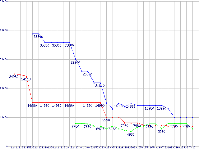 メモリ主要製品(最安値1万円以上)の最安値推移