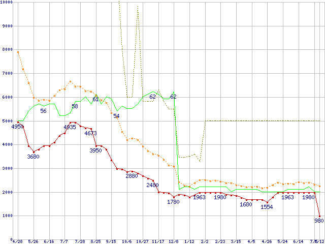 ※このグラフは過去のデータも税率5%相当に調整した税込み相当額のグラフです。 税率変更や、総額表示方式導入(2004年4月)の影響は除いています。 | | | ●凡例 | 最安値 (点線部は販売店未確認 または未調査) | 平均値 | 最高値 | ショップ数 |