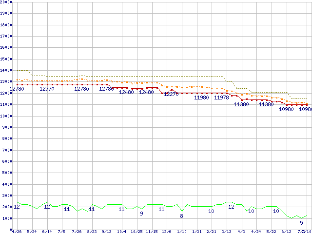 ※このグラフは過去のデータも税率5%相当に調整した税込み相当額のグラフです。 税率変更や、総額表示方式導入(2004年4月)の影響は除いています。 | | | ●凡例 | 最安値 (点線部は販売店未確認 または未調査) | 平均値 | 最高値 | ショップ数 |
