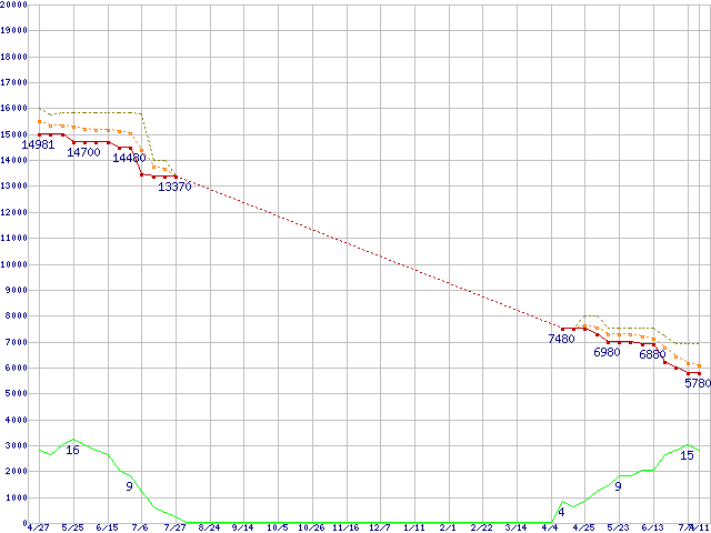 | Athlon X2 4600 (2.4GHz,L2 512KB×2)の価格推移 | | | (2007年4月27日~2008年7月11日) |