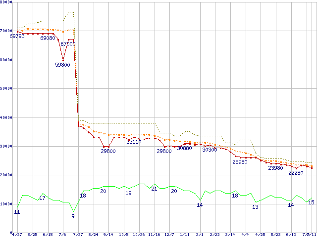 | Core 2 Quad Q6600 (2.40GHz,L2 4MB×2)の価格推移 | | | (2007年4月27日~2008年7月11日) |