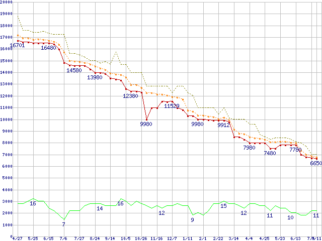 | Athlon X2 4800 (2.5GHz,L2 512KB×2)の価格推移 | | | (2007年4月27日~2008年7月11日) |