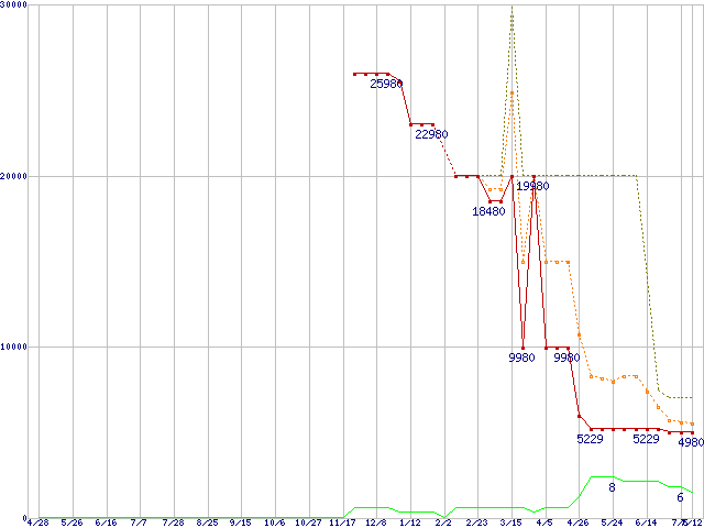 ※このグラフは過去のデータも税率5%相当に調整した税込み相当額のグラフです。 税率変更や、総額表示方式導入(2004年4月)の影響は除いています。 | | | ●凡例 | 最安値 (点線部は販売店未確認 または未調査) | 平均値 | 最高値 | ショップ数 |