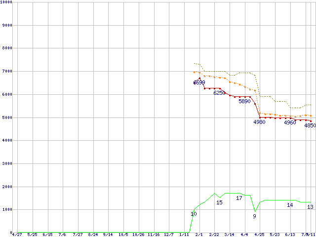 ※このグラフは過去のデータも税率5%相当に調整した税込み相当額のグラフです。 税率変更や、総額表示方式導入(2004年4月)の影響は除いています。 | | | ●凡例 | 最安値 (点線部は販売店未確認 または未調査) | 平均値 | 最高値 | ショップ数 |