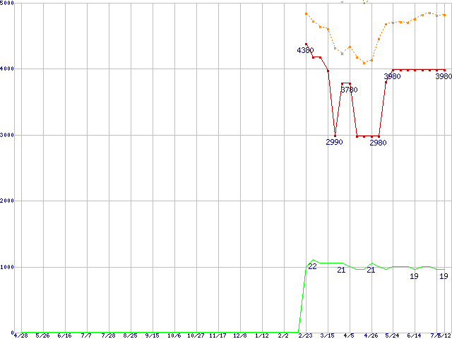 ※このグラフは過去のデータも税率5%相当に調整した税込み相当額のグラフです。 税率変更や、総額表示方式導入(2004年4月)の影響は除いています。 | | | ●凡例 | 最安値 (点線部は販売店未確認 または未調査) | 平均値 | 最高値 | ショップ数 |