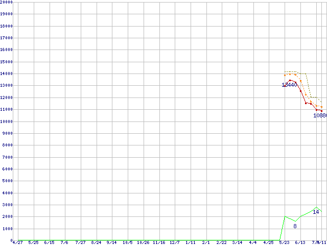 ※このグラフは過去のデータも税率5%相当に調整した税込み相当額のグラフです。 税率変更や、総額表示方式導入(2004年4月)の影響は除いています。 | | | ●凡例 | 最安値 (点線部は販売店未確認 または未調査) | 平均値 | 最高値 | ショップ数 |
