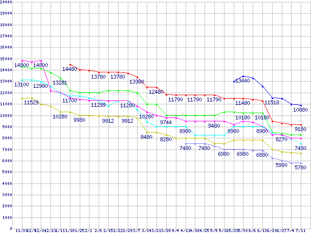 | Socket AM2 (HyperTransport,Dual Core,TDP 65W)の最安値推移 | | | (2007年11月30日~2008年7月11日) |