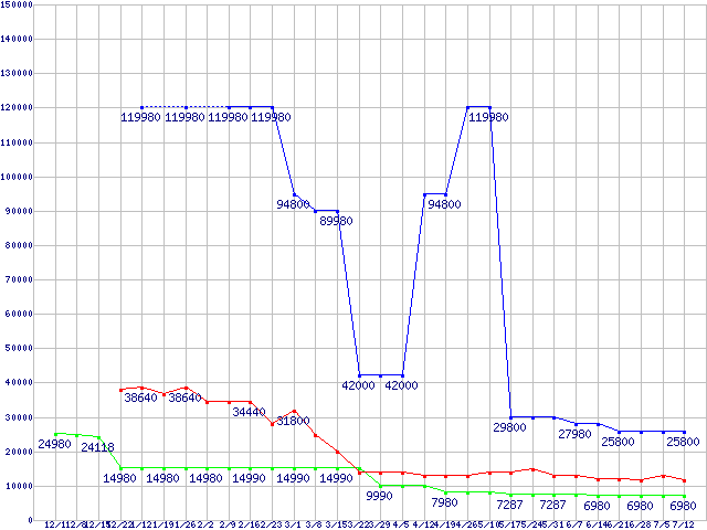 PC3-12800(DDR3-1600) DDR3 SDRAM DIMMの最安値推移